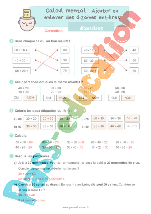 Correction Exercices Ajouter ou enlever des dizaines entières – CE1 pdf