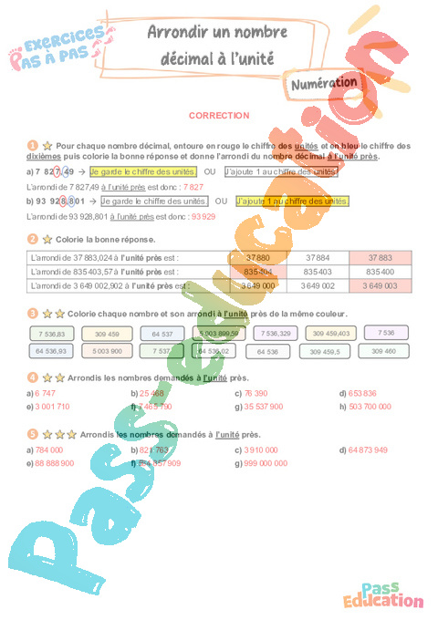 Correction Arrondir un nombre décimal à l’unité – CM2 – Exercices Pas à Pas pdf