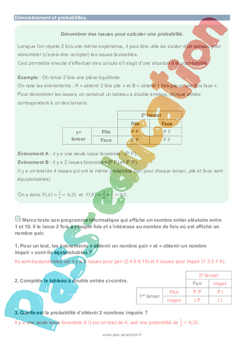 Il y a un total de 4 issues qui ont la même probabilité (car pour chaque lancer, pile et face sont équiprobables).
