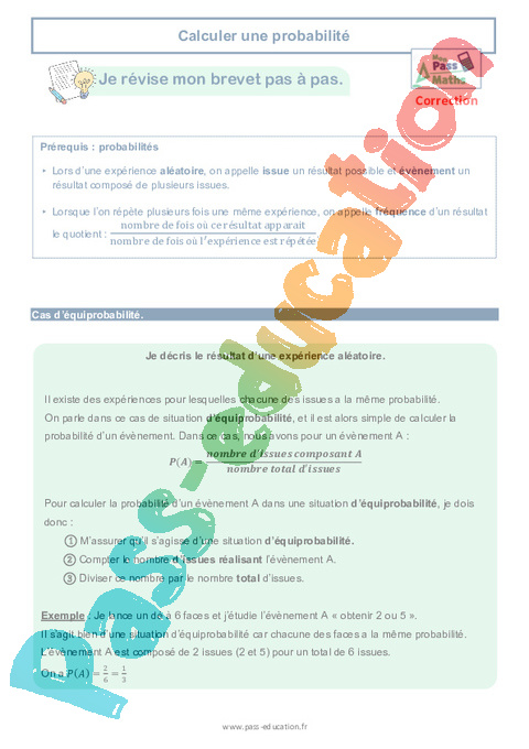 Correction Calculer une probabilité – 3ème – Brevet des collèges Mon Pass Maths rtf