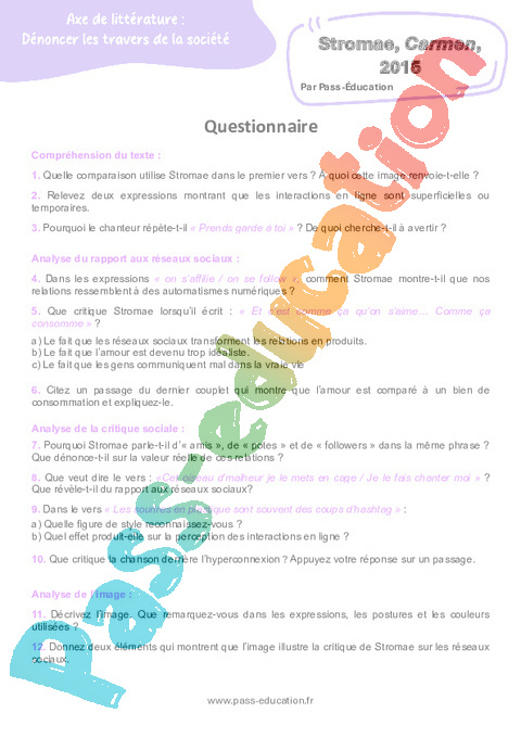 Questionnaire Carmen (Stromae) – 3ème pdf
