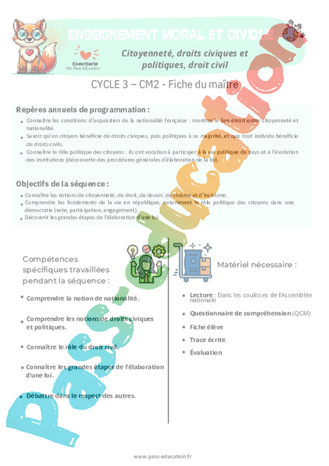 Fiche de préparation – Citoyenneté, droits civiques et politiques, droit civil – Cm2 – EMC Education morale et civique.