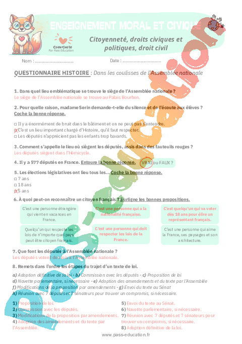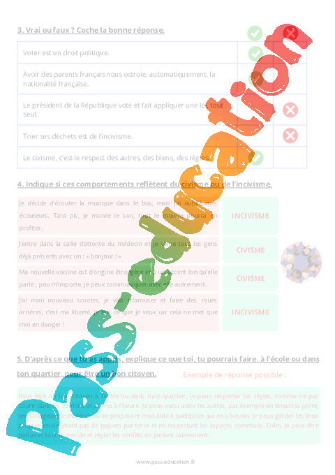 3. Correction – Questionnaire histoire Citoyenneté, droits civiques et politiques, droit civil – Cm2 pdf