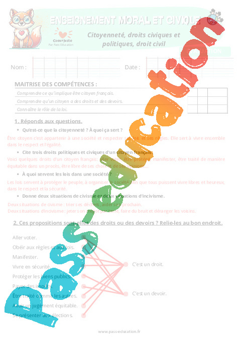 4. Correction- Fiche élève Citoyenneté, droits civiques et politiques, droit civil – Cm2 pdf
