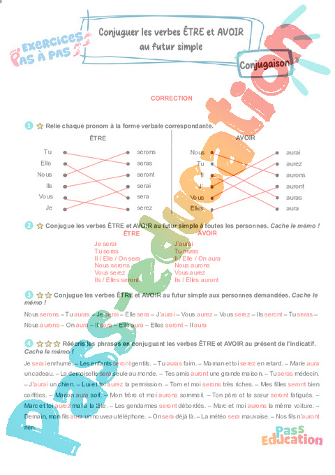Correction Conjuguer les verbes être et avoir au futur simple – CE2 – Exercices Pas à Pas rtf