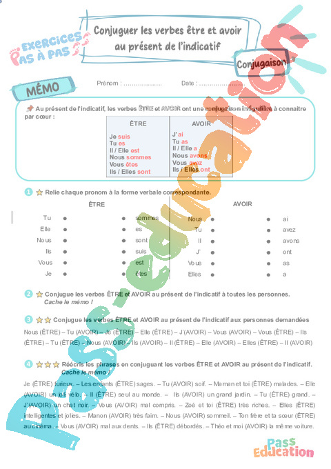 Exercices Pas à Pas avec mémo / leçon de conjugaison pour travailler la compétence : Conjuguer les verbes être et avoir au présent de l’indicatif au CM2.