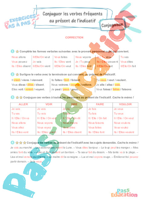 Correction Conjuguer les verbes fréquents au présent de l’indicatif – CE2 – Exercices Pas à Pas rtf