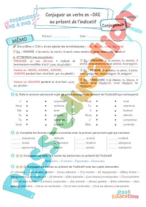 Exercices Pas à Pas avec mémo / leçon de conjugaison pour travailler la compétence : Conjuguer un verbe en -dre au présent de l’indicatif au CE2.