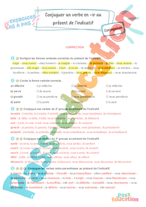 Correction Conjuguer un verbe en -ir au présent de l’indicatif – CM2 – Exercices Pas à Pas rtf