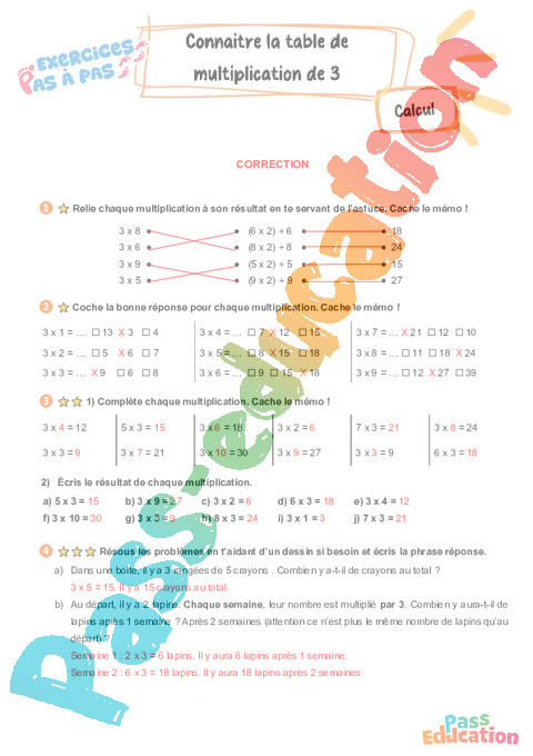 Correction Connaître la table de multiplication par 3 – CE2 – Exercices Pas à Pas pdf