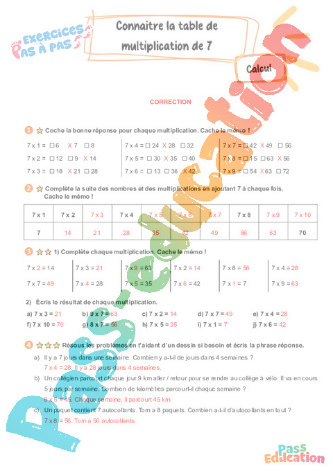 Correction Connaître la table de multiplication par 7 – CE2 – Exercices Pas à Pas pdf