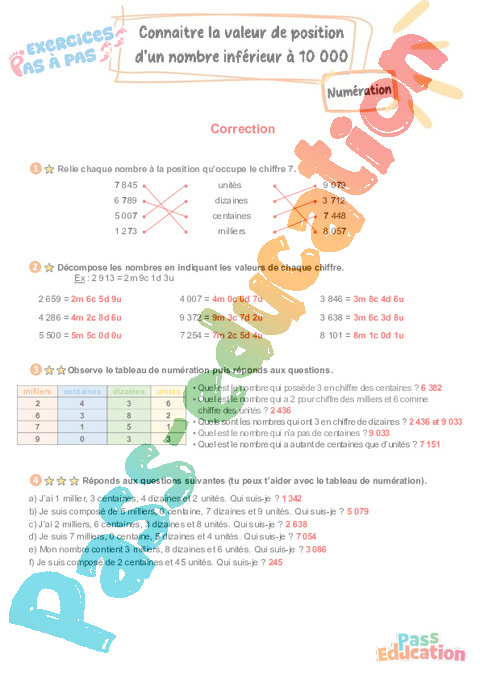 Exercices Pas à Pas avec mémo / leçon de mathématiques pour travailler la compétence : Connaitre la valeur de position d’un nombre inférieur à 10 000 au CE2.