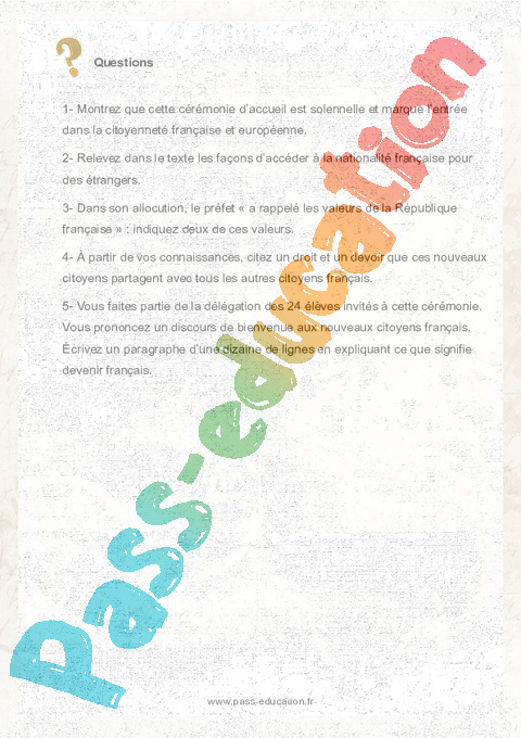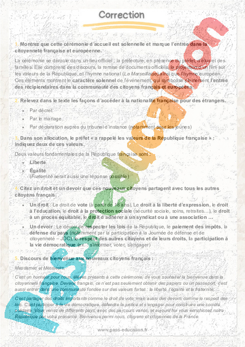 5- Vous faites partie de la délégation des 24 élèves invités à cette cérémonie. Vous prononcez un discours de bienvenue aux nouveaux citoyens français. Écrivez un paragraphe d’une dizaine de lignes en expliquant ce que signifie devenir français.