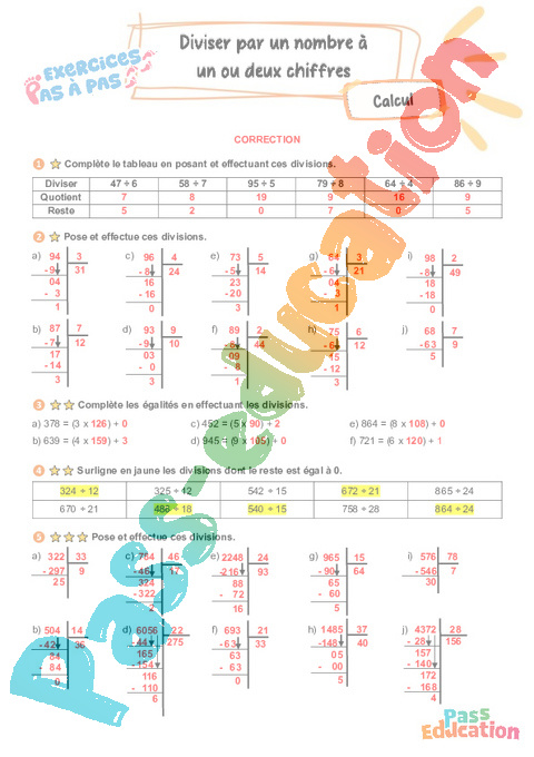 Correction Diviser par un nombre à un ou deux chiffres – CM2 – Exercices Pas à Pas pdf