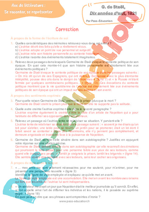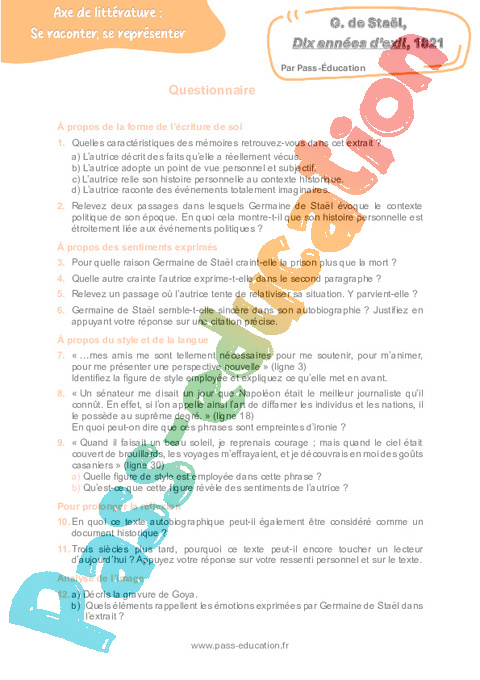 Correction Questionnaire Dix années d’exil (Germaine de Staël) – 3ème pdf