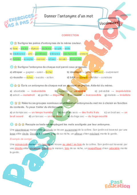 Correction Donner l’antonyme d’un mot – CM2 – Exercices Pas à Pas pdf