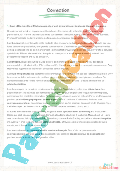 1. Sujet : Décrivez les différents espaces d’une aire urbaine et expliquez leurs dynamiques.