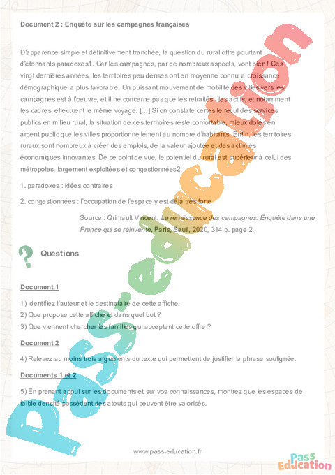 • Le document 2 montre que les campagnes bénéficient d’un renouveau démographique, notamment grâce à l’arrivée de jeunes actifs ou de cadres.