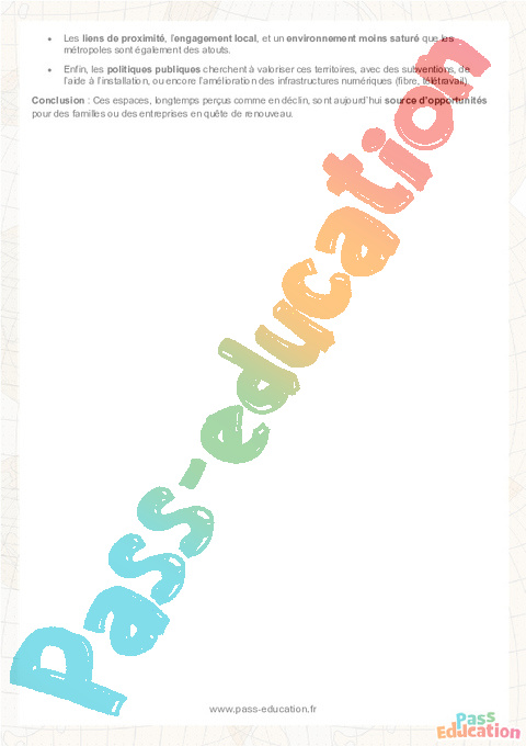 • Enfin, les politiques publiques cherchent à valoriser ces territoires, avec des subventions, de l’aide à l’installation, ou encore l’amélioration des infrastructures numériques (fibre, télétravail).