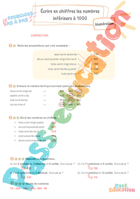 Correction Écrire en chiffres les nombres inférieurs à 1000 – CE2 – Exercices Pas à Pas pdf