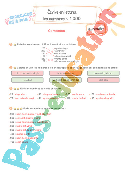 Correction Écrire en lettres les nombres inférieurs à 1 000 – CE2 – Exercices Pas à Pas pdf
