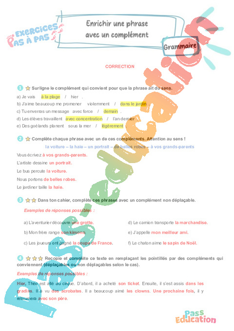 Correction Enrichir une phrase avec un complément – CE2 – Mémo + Exercices Pas à Pas pdf