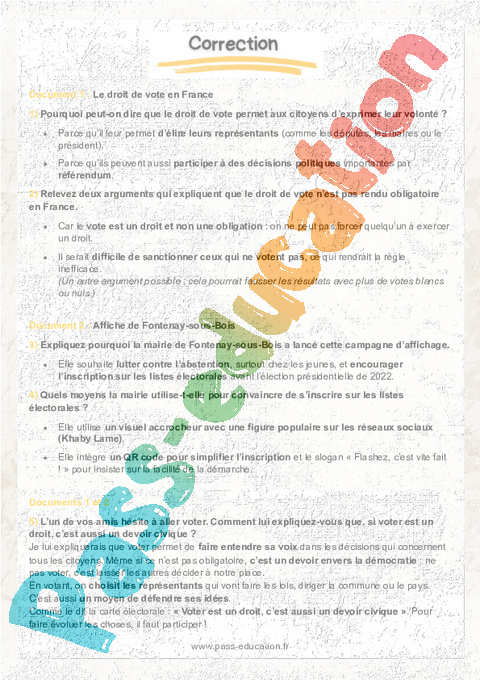 1) Pourquoi peut-on dire que le droit de vote permet aux citoyens d’exprimer leur volonté ? Deux éléments de réponse sont attendus.