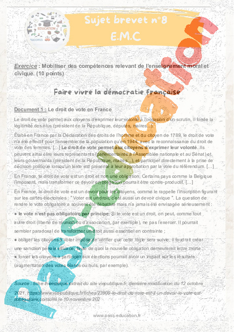 8 Faire vivre la démocratie française Sujets et corrigés du Brevet EMC pdf