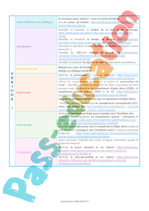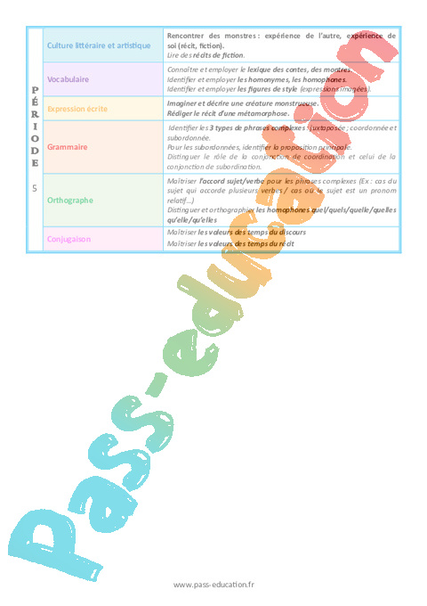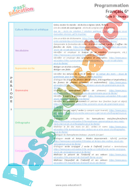 | Orthographe | Maîtriser l’accord sujet / verbe (y compris sujet inversé). https://www.pass-education.fr/l-accord-du-verbe-avec-son-sujet-cours-dorthographe-pour-la-6eme/