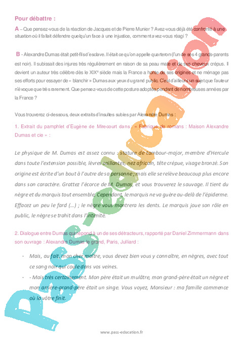 B – Alexandre Dumas était petit-fils d’esclave. Il était ce qu’on appelle quarteron (l’un de ses 4 grands-parents est noir). Il subissait des injures très régulièrement en raison de sa peau mate et de ses cheveux crépus. Il devient un auteur très célèbre dès le XIXe siècle mais la France a honte de ses origines et ne ménage pas ses efforts pour essayer de « blanchir » Dumas aux yeux du grand public. C’est d’ailleurs un sujet que l’auteur n’évoque que très rarement. Que pensez-vous de cette posture adoptée pendant de nombreuses années par la France ?