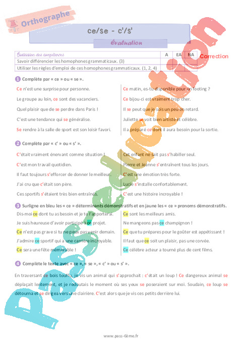 Correction Homophones grammaticaux (ce ou c’ se ou s’) – Evaluation d’orthographe pour la 6ème pdf
