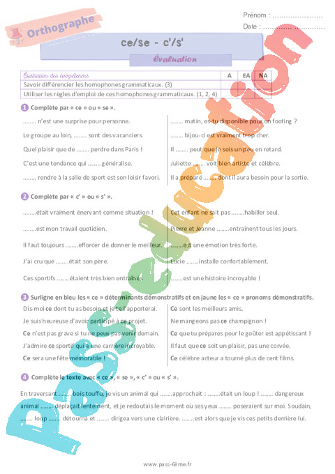Homophones grammaticaux (ce ou c’ se ou s’) – Evaluation d’orthographe pour la 6ème pdf