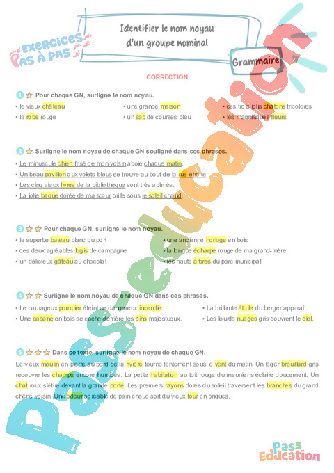 Correction Exercices Identifier le nom noyau d’un groupe nominal – CM2 – Exercices Pas à Pas rtf