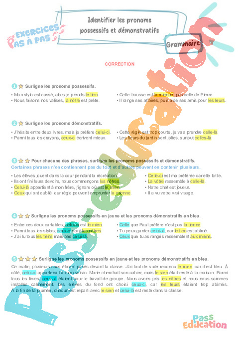 Correction Exercices Identifier les pronoms possessifs et démonstratifs – CM2 pdf