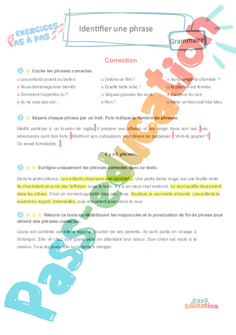 Correction Identifier une phrase – CE2 – Exercices Pas à Pas pdf
