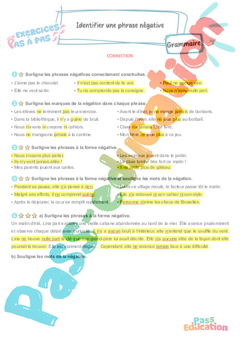Correction Identifier une phrase négative – CM2 – Exercices Pas à Pas pdf