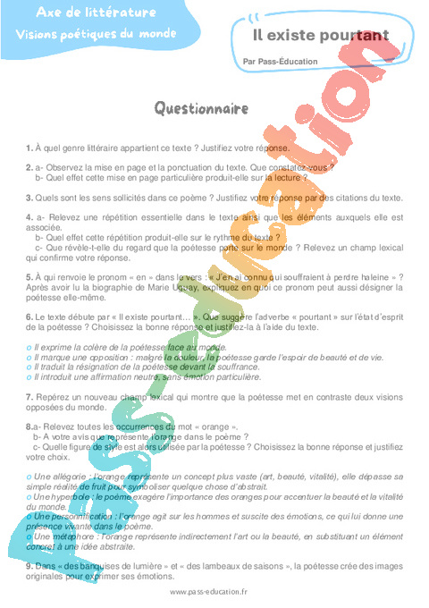 Questionnaire 3ème Il existe pourtant (Marie Uguay) pdf