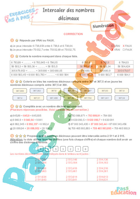 Correction Intercaler des nombres décimaux – CM2 – Exercices Pas à Pas rtf