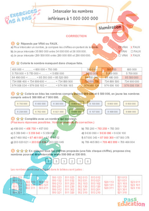 Correction Intercaler les nombres inférieurs à 1 000 000 000 – CM2 – Exercices Pas à Pas pdf