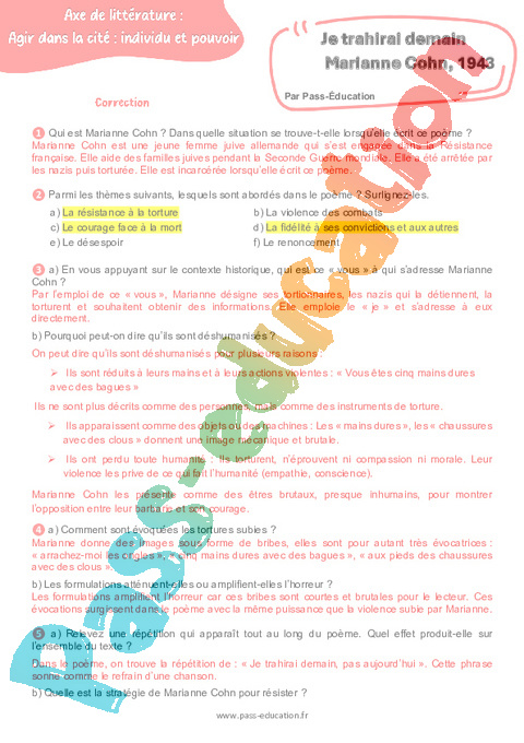 Correction Questionnaire Je trahirai demain (Marianne Cohn) – 3ème pdf