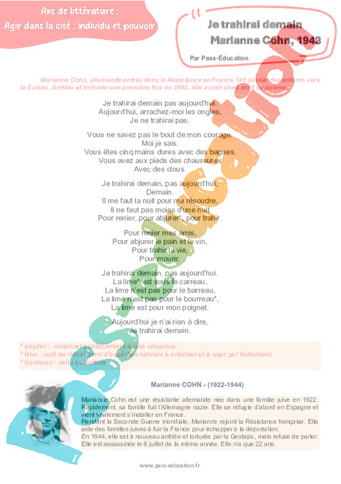 Littérature Je trahirai demain (Marianne Cohn) – 3ème pdf
