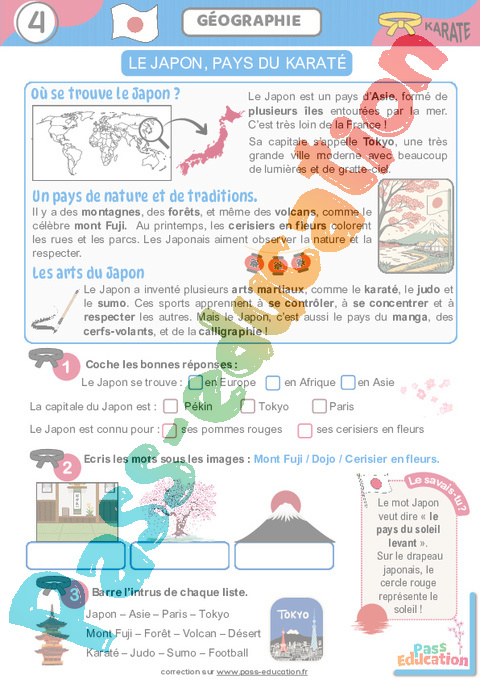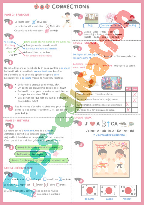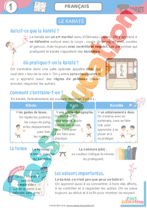 Relier chaque mot à sa définition : karategi, kihon, kata, kumite, obi.