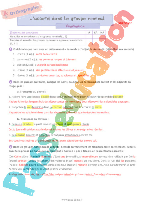 Correction Evaluation 6ème L’accord dans le groupe nominal pdf