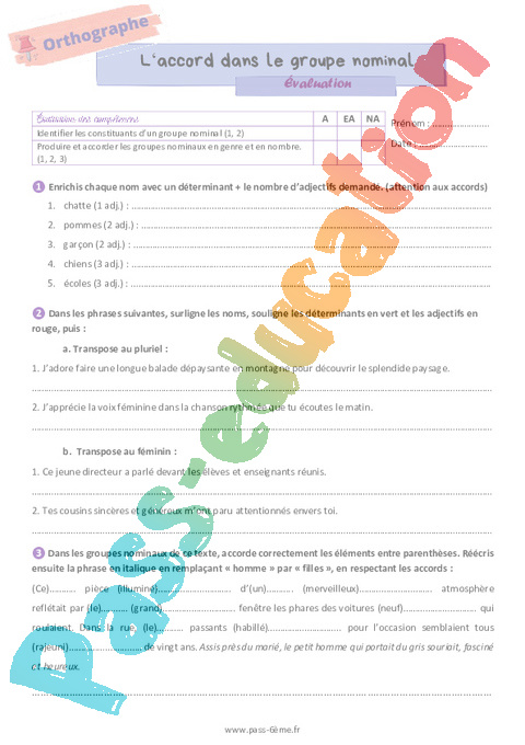 Evaluation 6ème L’accord dans le groupe nominal pdf