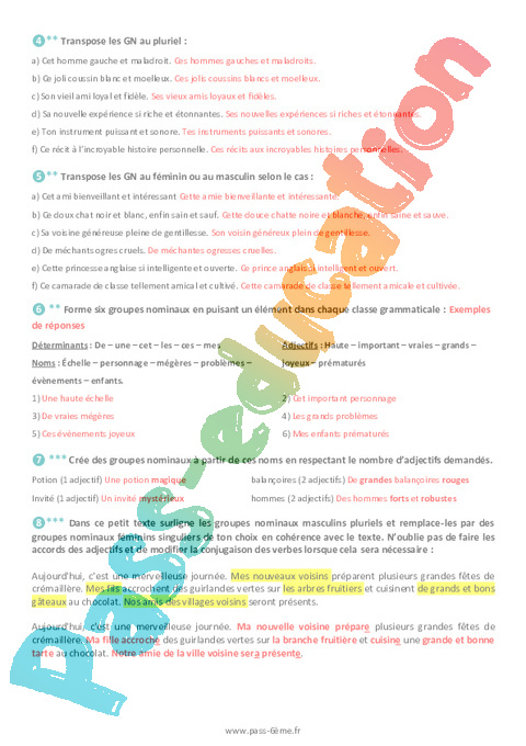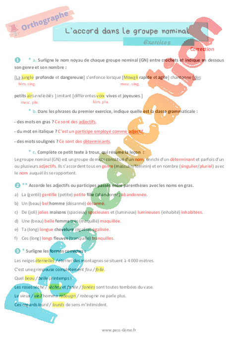 Correction Exercices 6ème L’accord dans le groupe nominal pdf