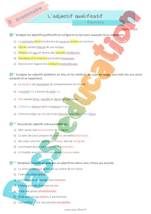 Exercices de grammaire avec la correction sur l’adjectif qualificatif en 6ème.