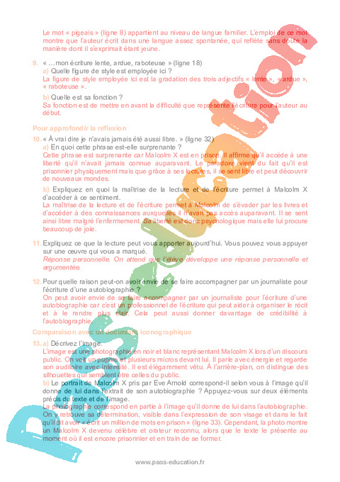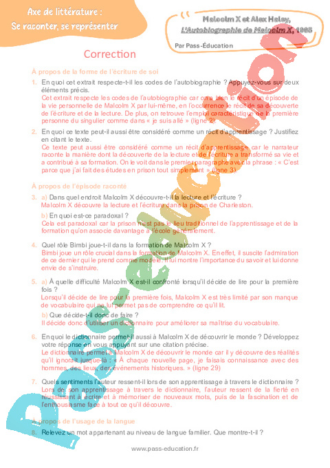 Correction Questionnaire L’Autobiographie de Malcolm X (Malcolm X et Alex Haley) – 3ème pdf