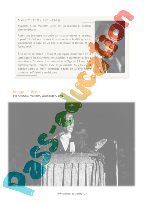 b) Le portrait de Malcolm X pris par Eve Arnold correspond-il selon vous à l’image qu’il donne de lui dans l’extrait de son autobiographie ? Appuyez-vous sur deux éléments précis du texte et de l’image.