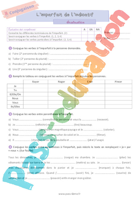Evaluation L’imparfait de l’indicatif 6ème pdf