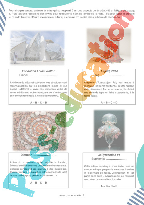 Tu devras ensuite (sur la page 2) faire correspondre une définition à une de ces œuvres artistiques contemporaines. Toutes ces définitions peuvent correspondre à chacune des œuvres. Mais il y a un ou plusieurs indices, qui permettent de n’en choisir qu’une seule.